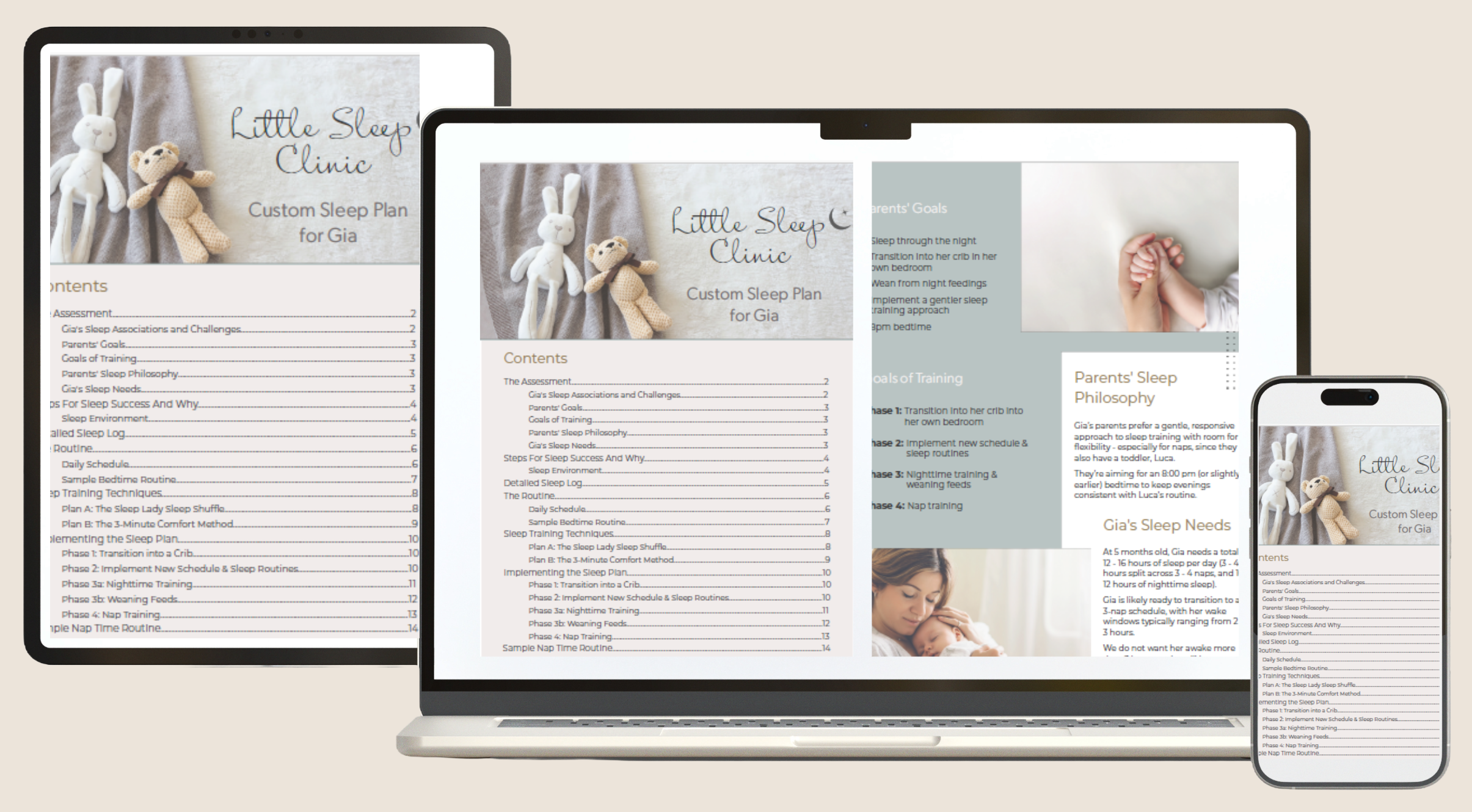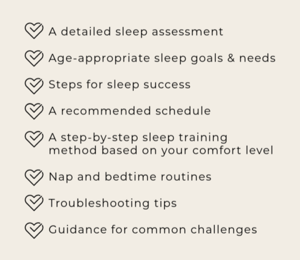 Your plan will include a detailed sleep assessment, age-appropriate sleep goals, a step-by-step sleep training method based on your comfort level, nap and bedtime routines, a recommended schedule, troubleshooting tips, and guidance for common challenges.